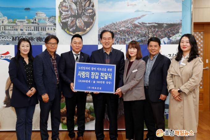 Áøµµ±ºÀÇ ÇâÅä±â¾÷ÀÎ DH±×·ìÀÇ ±è³²Áß È¸Àå°ú Á÷¿øµéÀÌ Áøµµ±ºÃ»À» ¹æ¹®, ³ëÀÎÀÏÀÚ¸®¿Í »çȸȰµ¿Áö¿ø Âü¿© ¾î¸£½ÅµéÀ» À§ÇØ 500¸¸¿ø »ó´çÀÇ ÀÛ¾÷¿ë Àå°©À» Àü´ÞÇß´Ù.