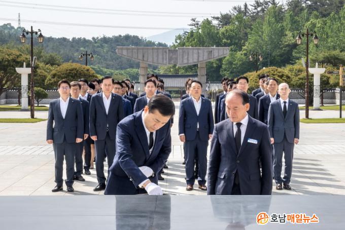 °íº´ÀÏ ±¤ÁÖÀºÇàÀåÀº ÇÔ²²ÇÑ ÀÓÁ÷¿øµé¿¡°Ô ¡°¹ÎÁÖÁÖÀÇ¿Í ÀαÇÀ» À§ÇØ Èñ»ýÇϽŠ¿À¿ù¿µ·ÉÀÇ Á¤½ÅÀ» °¡½¿¼Ó ±íÀÌ »õ±âÀÚ¡±°í °Á¶Çϸç, ¡°±¤ÁÖ¡¤Àü³² ´ëÇ¥ÀºÇàÀ¸·Î¼ 5¡¤18 °øµ¿Ã¼ Á¤½ÅÀ» °è½ÂÇÏ¿© Áö¿ª¹Î°úÀÇ »ó»ýÀ» À§ÇØ Àû±Ø ³ë·ÂÇϰڴ١±°í ¸»Çß´Ù.