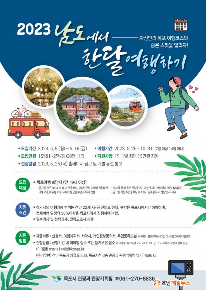 ½Ã´Â ¿©ÇàÀÛ°¡, ÆÄ¿öºí·Î°Å, À¯Æ©¹ö µî ÆÄ±Þ·ÂÀÌ Å« ÀÎÇ÷ç¾ð¼¸¦ ¿ì´ë ¼±Á¤ÇÑ´Ù. ¼±Á¤µÈ Âü°¡ÀÚ´Â Àü³² 22°³ ½Ã¡¤±º Àüü¸¦ ¿©ÇàÇÒ ¼ö ÀÖÁö¸¸ ¼÷¹ÚÀº ¸ñÆ÷¿¡¼¸¸ ÇØ¾ßÇϸç, Àüü ¿©Çà ÀÏÁ¤ÀÇ 50% ÀÌ»óÀ» ¸ñÆ÷¿¡¼ ÁøÇàÇØ¾ß ÇÑ´Ù. Âü°¡ÀÚ¿¡°Ô´Â ¼÷¹Úºñ, ±³Åëºñ, ½Äºñ, üÇèȰµ¿ºñ µîÀ» Æ÷ÇÔÇØ 1Àδç ÇÏ·ç ÃÖ´ë 15¸¸¿øÀ» Áö¿øÇϸç, Áö¿ø Çѵµ ³»¿¡¼ ÀÚÀ¯·Ó°Ô ¿©Çà ÀÏÁ¤À» °èȹÇÏ°í ¿©ÇàÀÌ ³¡³ª¸é °³ÀÎ SNS¿¡ È«º¸ °Ô½Ã¹° ÀÛ¼º µîÀÇ °úÁ¦¸¦ ¼öÇàÇÏ¸é µÈ´Ù.