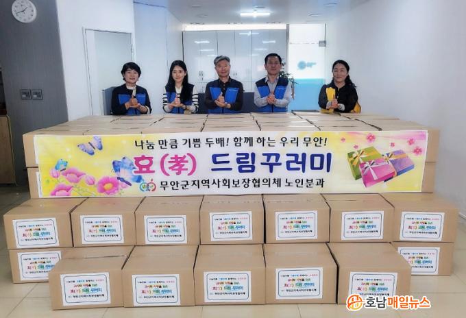 ÀÌ »ç¾÷Àº ¹«¾È±ºÁö¿ª»çȸº¸ÀåÇùÀÇü ³ëÀκаú¿¡¼ ÃßÁøÇÏ´Â »ç¾÷À¸·Î ¾î¹öÀ̳¯À» ¸ÂÀÌÇÏ¿© °Åµ¿ÀÌ ºÒÆíÇÏ¿© »ý°èÀ¯Áö¿¡ ¾î·Á¿òÀ» °Þ°í ÀÖ´Â µ¶°Å ¾î¸£½ÅµéÀ» À§ÇØ »ýÇÊǰ, ÀǾàǰ, Áï¼®½Äǰ µî 16Á¾ÀÌ ´ã±ä 5¸¸ ¿ø »ó´çÀÇ È¿(üø) µå¸² ²Ù·¯¹Ì¸¦ À§¿øµéÀÌ »ç¶û°ú °¨»çÀÇ ¸¶À½À» ´ã¾Æ Á÷Á¢ Á¦ÀÛÇÏ¿´´Ù.
