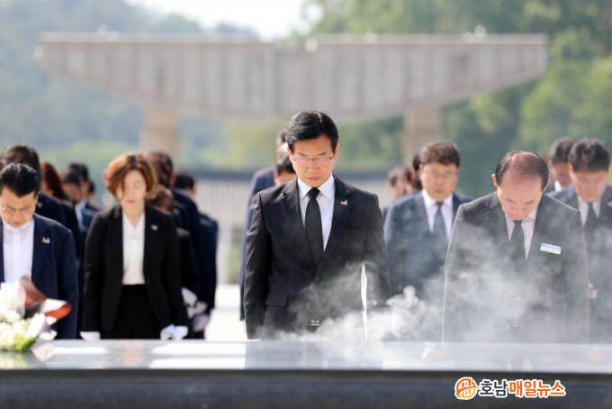 ¹Úº´±Ô ±¤»ê±¸Ã»Àå°ú ±¤»ê±¸ °£ºÎ°ø¹«¿øµéÀº Á¦43ÁÖ³â 5‧18¹ÎÁÖȿ ±â³äÀÏÀ» ¾ÕµÎ°í 11ÀÏ ±¹¸³5‧18¹ÎÁÖ¹¦Áö¸¦ Âü¹èÇß´Ù. ¹Úº´±Ô ûÀåÀÇ ÇåÈ‧ºÐÇâÀ» ½ÃÀÛÀ¸·Î ¿À¿ù ¿µ·ÉÀÇ ³ÌÀ» ±â¸®´Â ¹¬³äÀ» ¸¶Ä£ µÚ¿¡´Â À±»ó¿ø ¿»ç ¹¦¸¦ Âü¹èÇß´Ù. À̾î 5‧18¹ÎÁßÇ×Àï ´ç½Ã ½Ã¹Î±º ´ëº¯ÀÎÀ¸·Î ÅõÀïÇÑ À±»ó¿ø ¿»ç »ý°¡¸¦ ¹æ¹®ÇØ ¿»ç¸¦ Ã߸ðÇϰí Á¤½ÅÀ» µÇ»õ±â´Â ½Ã°£À» °¡Á³´Ù.