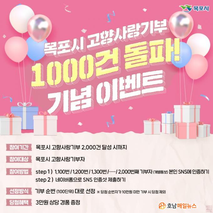 À̹ø¿¡ ÁøÇàµÇ´Â À̺¥Æ®´Â °íÇâ»ç¶û±âºÎ 2,000°Ç Á¶±â´Þ¼ºÀ» ¸ñÇ¥·Î ÁøÇàµÈ´Ù. 1,100¹øÂ° ±âºÎÀÚ¸¦ ½ÃÀÛÀ¸·Î 100´ÜÀ§¾¿ 2,000¹øÂ° ±âºÎÀÚ±îÁö ÃÑ 10¸íÀ» ¼±Á¤ÇØ º»ÀÎ SNS¿¡ ±âºÎ ÀÎÁõ½Ã 3¸¸¿ø »ó´çÀÇ °æÇ°À» Áö±ÞÇÑ´Ù.
