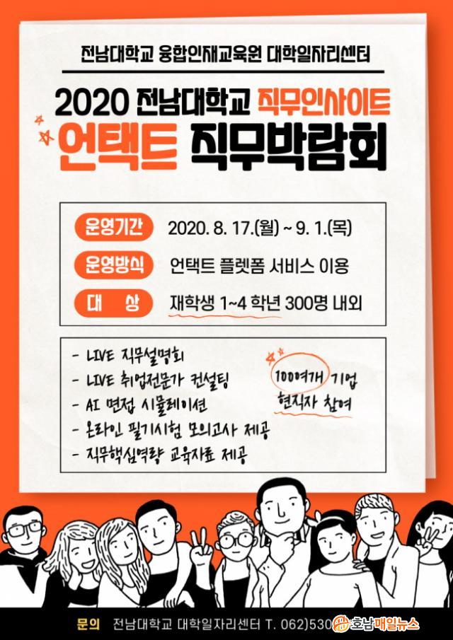 Àü³²´ë ´ëÇÐÀÏÀÚ¸®¼¾ÅÍ(¼¾ÅÍÀå ÀÌÀç¿)´Â ¿À´Â 8¿ù 17ÀϺÎÅÍ 9¿ù 1ÀϱîÁö ¾ðÅÃÆ® Ç÷§Æû ¼ºñ½º¸¦ Ȱ¿ëÇØ ¡®2020 Àü³²´ëÇб³ Á÷¹«ÀλçÀÌÆ® ¾ðÅÃÆ® Á÷¹«¹Ú¶÷ȸ¡¯¸¦ °¡Áø´Ù.