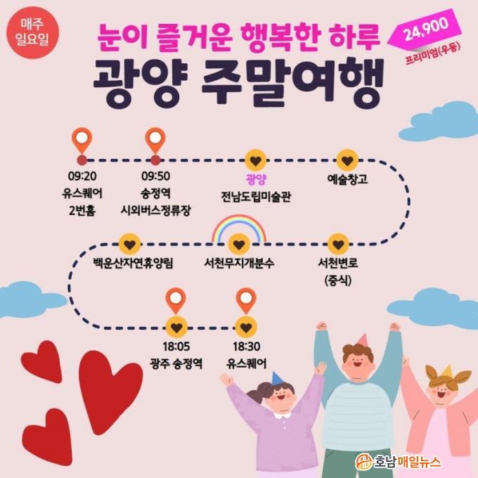 ±¤¾çÁÖ¸»¿©ÇàÀº ¸ÅÁÖ ÀÏ¿äÀÏ ±¤ÁÖ À¯½ºÄù¾î(9½Ã20ºÐ)¸¦ Ãâ¹ßÇØ ±¤ÁÖ¼ÛÁ¤¿ª(9½Ã50ºÐ)À» °æÀ¯, ±¤¾ç ¿øµµ½ÉÀÇ Àü³²µµ¸³¹Ì¼ú°ü, ±¤¾ç¿¹¼úâ°í µîÀ» °ü¶÷ÇÑ´Ù.