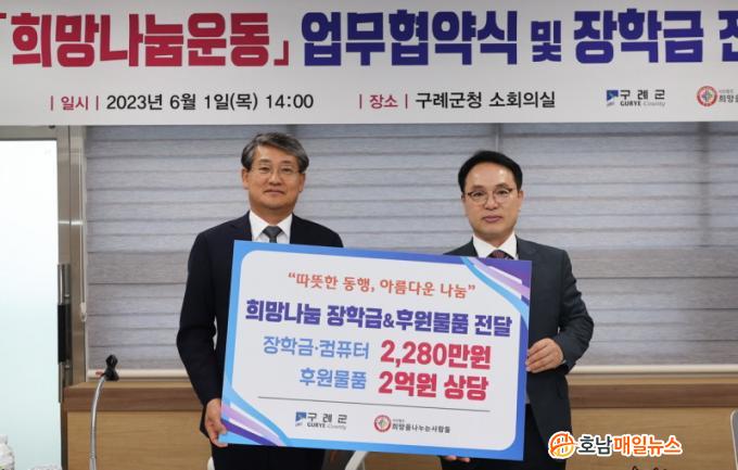 À̹ø Çù¾àÀ» ÅëÇØ (»ç)Èñ¸ÁÀ»³ª´©´Â»ç¶÷µéÀº ±¸·Ê±º °ÅÁÖ ¾Æµ¿¡¤Ã»¼Ò³âÀ» À§ÇØ 2³â°£ 2¾ï 2,280¸¸ ¿ø »ó´çÀÇ ÀåÇбݰú ¹°Ç°À» Áö¿øÇÏ°Ô µÈ´Ù. ±×Áß 1,800¸¸ ¿øÀÇ ÀåÇбݰú 240¸¸ ¿ø »ó´çÀÇ ÄÄÇ»Å͸¦ À̹ø Çù¾à½Ä¿¡¼ 17¸íÀÇ Çлý¿¡°Ô Á÷Á¢ Àü´ÞÇß´Ù.