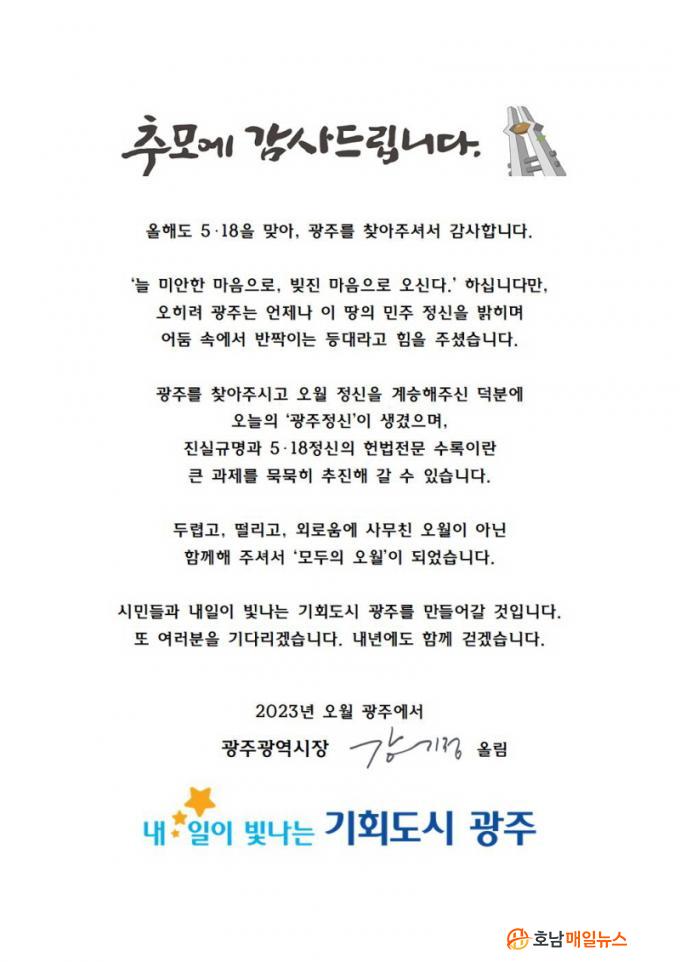 ° ½ÃÀåÀº ¡°¿ÃÇØµµ 5¡¤18À» ¸Â¾Æ ±¤ÁÖ¸¦ ã¾ÆÁÖ°í ÇÔ²²ÇØÁּż °¨»çµå¸°´Ù¡±¸é¼ ¡°¡®´Ã ¹Ì¾ÈÇÑ ¸¶À½À̰í, ºúÁø ¸¶À½ÀÌ´Ù¡¯¶ó°í ÇϽÃÁö¸¸ ¿ÀÈ÷·Á ±¤ÁÖ´Â ¾ðÁ¦³ª ÀÌ ¶¥ÀÇ ¹ÎÁÖ Á¤½ÅÀ» ¹àÈ÷¸ç ¾îµÒ ¼Ó¿¡¼ ¹Ý¦ÀÌ´Â µî´ë¶ó°í ÈûÀ» ÁֽŠ¿©·¯ºÐµéÀÌ Àֱ⿡ ¿Ü·ÓÁö ¾Ê´Ù¡±°í ¸»Çß´Ù.