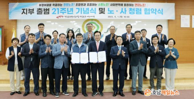³ªÁֽô ÃÖ±Ù ½Ãû»ç ´ëȸÀǽǿ¡¼ °ø¹«¿ø³ëÁ¶³ªÁÖ½ÃÁöºÎ¿Í ¹ÝºÎÆÐ¡¤Ã»·Å °øµ¿½Çõ Çù¾à½ÄÀ» °¡Á³´Ù°í 4ÀÏ ¹àÇû´Ù. Çù¾à½Ä¿¡´Â À±º´Å ½ÃÀå, °¿µ±¸ ºÎ½ÃÀå°ú °£ºÎ °ø¹«¿ø, ÀÓÁø±¤ ÁöºÎÀåÀ» ºñ·ÔÇÑ ³ëÁ¶ °ø¹«¿ø 150¿©¸íÀÌ Âü¼®ÇØ »óÈ£ Á¸Áß°ú ½Å·Ú¸¦ ¹ÙÅÁÀ¸·Î ÇÑ Ã»·Å ³ªÁÖ ±¸Çö¿¡ ÈûÀ» ¸ðÀ¸±â·Î Çß´Ù.