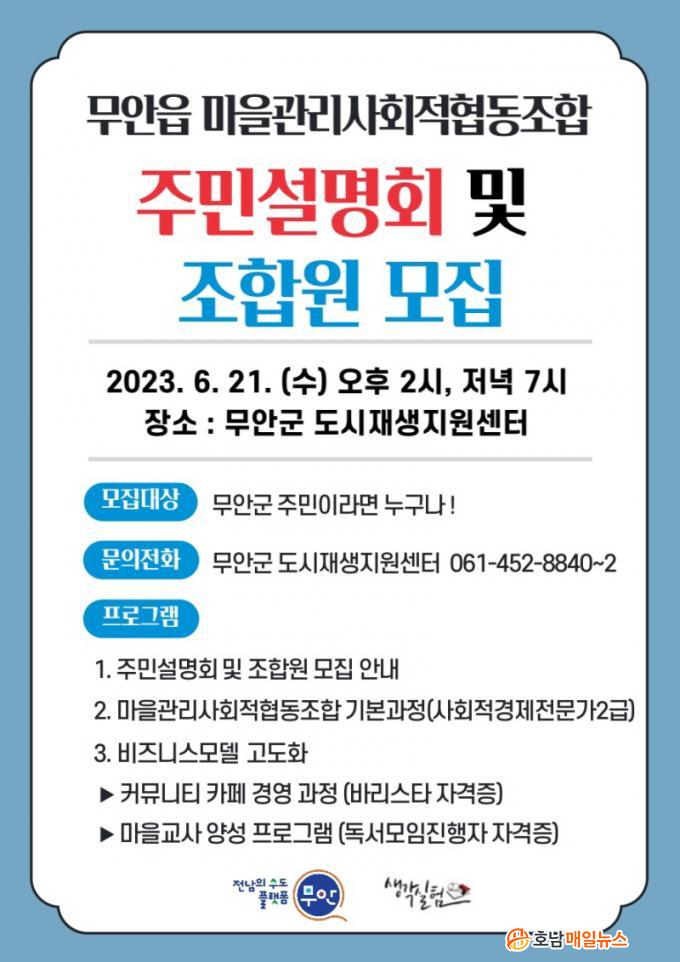 Áö³ 2¿ù¿¡ ±¹Åä±³ÅëºÎ·ÎºÎÅÍ Àΰ¡¹ÞÀº ¹«¾È±º µµ½ÃÀç»ý ¸¶À»°ü¸®»çȸÀûÇùµ¿Á¶ÇÕ(ÀÌ»çÀå ±èµµÇü)ÀÇ º»°ÝÀûÀÎ ¿î¿µÀ» À§ÇÏ¿© Áֹμ³¸íȸ¸¦ ÅëÇØ ½Ç¹«¿ª·® °È ¿î¿µ °úÁ¤À» ¼Ò°³Çϰí ÇâÈÄ »ç¾÷¿¡ Á÷Á¢ Âü¿©ÇÒ Á¶ÇÕ¿øÀ» ¸ðÁýÇÏ°Ô µÈ´Ù.