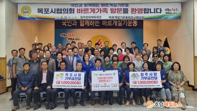 À̳¯ ¸ñÆ÷½Ã ¹Ù¸£°Ô»ì±â¿îµ¿ÇùÀÇȸ(ȸÀå ³ë¿¬ÅÃ)¿Í ûÁֽà ¹Ù¸£°Ô»ì±â¿îµ¿ÇùÀÇȸ(ȸÀå ÀÌÅÂÈñ) ȸ¿ø 50¿©¸íÀº ûÁÖ¹®ÈüÀ°È¸°ü¿¡ ¸ð¿© ±³·ù½ÄÀ» ÇÔ²² ÇßÀ¸¸ç, º¸´Ù ¶æ±íÀº ¿ìÀǸ¦ ´ÙÁö°íÀÚ ¾ç ÇùÀÇȸ ȸÀå°£ °íÇâ»ç¶û±âºÎ±Ý 100¸¸¿øÀ» »óÈ£ ±âŹÇß´Ù.