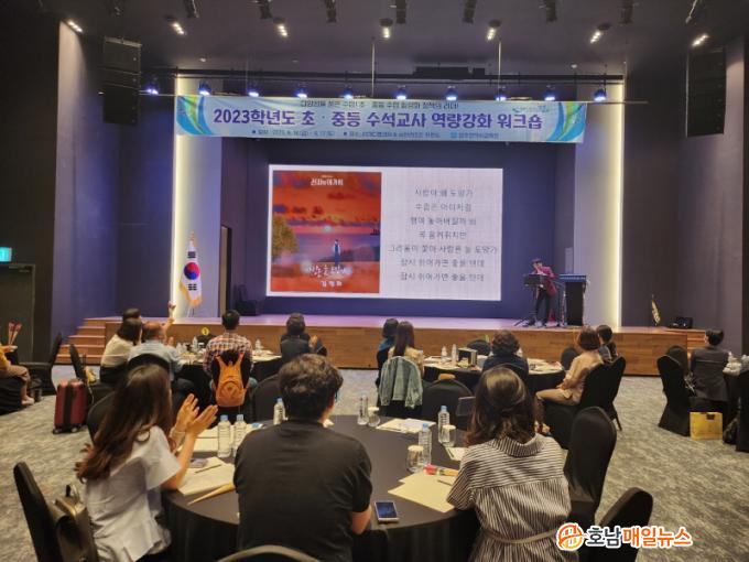 18ÀÏ ½Ã±³À°Ã»¿¡ µû¸£¸é ¡®ÃÊ‧Áßµî ¼ö¼®±³»ç ¿ª·®°È ¿öÅ©¼ó¡¯¿¡´Â ÃÊ‧Áßµî ¼ö¼®±³»ç¿Í ±³À°Àü¹®Á÷¿ø µî 50¿© ¸íÀÌ Âü¼®Çß´Ù. À̹ø ¿öÅ©¼óÀº ¼ö¼®±³»ç ¿ªÇÒ ¼öÇà °ü·Ã ¿ª·®°È ¿¬¼öÇÁ·Î±×·¥À» ÅëÇØ ¼ö¼®±³»çÀÇ Àü¹®¼ºÀ» ½ÅÀåÇϱâ À§Çؼ´Ù. ¶Ç ¼ö¼®±³»çÀÇ ¼ö¾÷ Ȱ¼ºÈ Á¤Ã¥ Áö¿ø ¹æ¾ÈÀ» ±³À°Àü¹®Á÷¿ø°ú ÇÔ²² ³íÀÇÇϱâ À§ÇÑ ÀåÀ¸·Î ¸¶·ÃÇß´Ù.