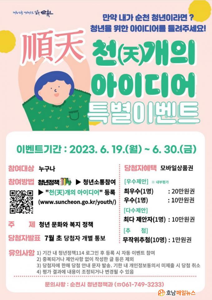 ´ç÷ÀÚ ¹ßÇ¥´Â 7¿ù ÃÊ ¡®Ã»³âÁ¤Ã¥114¡¯ »õ¼Ò½Ä¿¡ °ÔÀç ÈÄ ´ç÷ÀÚ¿¡°Ô °³º°Å뺸ÇÒ ¿¹Á¤À̸ç, À̺¥Æ®¿¡ ´ëÇÑ ÀÚ¼¼ÇÑ »çÇ×Àº ¼øÃµ½Ã û³âÁ¤Ã¥°ú(061-749-3233)·Î ¹®ÀÇÇÏ¸é µÈ´Ù. ¸ðÁýµÈ ¾ÆÀ̵ð¾î´Â Á¤Ã¥ ¼±È£µµÁ¶»ç¿Í ÇØ´çºÎ¼ÀÇ ½ÇÇà°¡´É¼º °ËÅä ÈÄ ±¸Ã¼ÀûÀÎ ½ÇÇà°èȹ ¼ö¸³À» °ÅÃÄ Á¤Ã¥À¸·Î ¹Ý¿µµÈ´Ù.