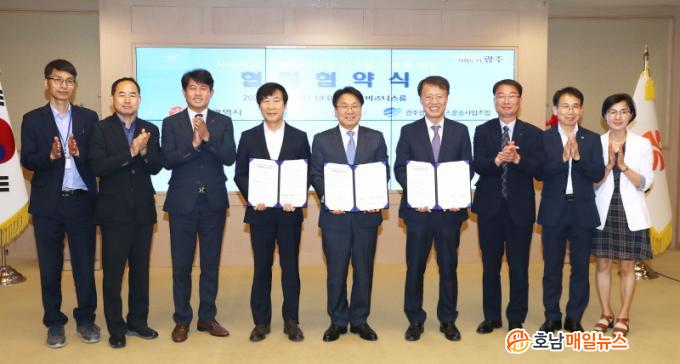 ±¤Áֽô À̸¦ À§ÇØ 20ÀÏ ¿ÀÈÄ ½Ãû ºñÁî´Ï½º·ë¿¡¼ °±âÁ¤ ±¤ÁÖ±¤¿ª½ÃÀå°ú ±Ç¿ëº¹ Çѱ¹±³Åë¾ÈÀü°ø´Ü ÀÌ»çÀå, ÀÓµ¿Ãá ±¤Áֽùö½º¿î¼Û»ç¾÷Á¶ÇÕ ÀÌ»çÀåÀÌ Âü¼®ÇÑ °¡¿îµ¥ ¡®½Ã³»¹ö½º ¾ÈÀü¸ð´ÏÅ͸µ ½Ã½ºÅÛ ±¸Ãà ¾÷¹«Çù¾à¡¯À» ü°áÇÏ°í ¹Î¡¤°ü Çù¾÷À¸·Î »ç¾÷À» ÃßÁøÇÑ´Ù.