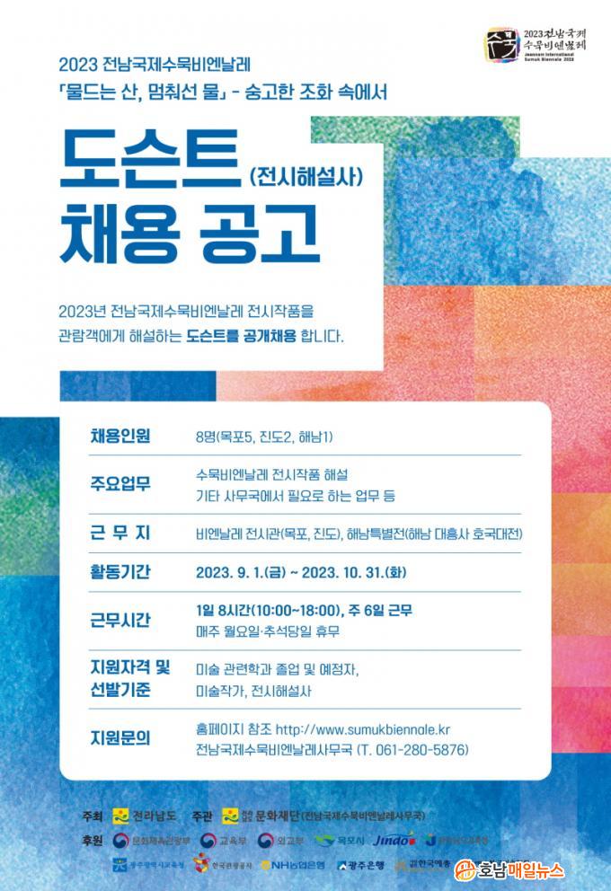 ÇÑÆí, °ü·Ã ½Åû¼·ù´Â Àü³²±¹Á¦¼ö¹¬ºñ¿£³¯·¹(www.sumukbiennale.kr)¿Í Àü³²¹®ÈÀç´Ü(www.jncf.or.kr) °øÁö»çÇ׿¡¼ È®ÀÎÇÒ ¼ö ÀÖ´Ù. ÀÚ¼¼ÇÑ »çÇ×Àº Àü³²±¹Á¦¼ö¹¬ºñ¿£³¯·¹ »ç¹«±¹ Çà»ç¿î¿µÆÀ(061-286-5876)À¸·Î ¹®ÀÇÇÏ¸é µÈ´Ù.