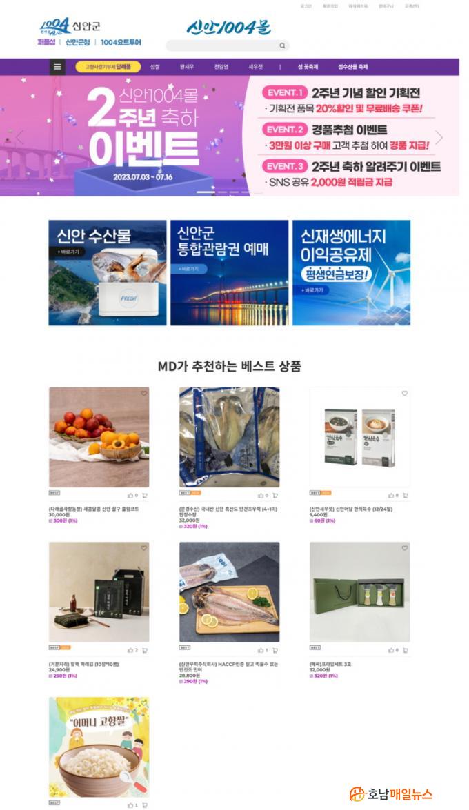 ¡®½Å¾È1004¸ô(www.shinan1004mall.kr)¡¯Àº ºñ´ë¸é ¿Â¶óÀÎ ¼ÒºñÆ®·»µå¿¡ ´ëÀÀÇϱâ À§ÇÏ¿© ½Å¾È±º¿¡¼ °³¼³ÇÑ ³ó¼öƯ»ê¹° ¿Â¶óÀÎ ¼îÇθô·Î, ¿Õ»õ¿ì, õÀÏ¿°, ±è, È«¾î, ³«Áö, »õ¿ìÁ£, À¯±â³ó½Ò, ¸¶´Ã, ¾çÆÄ, ¼¶ÃÊ, ´ëÆÄ µî °¹¹úÀ» ǰÀº ûÁ¤ Áö¿ª¿¡¼ »ý»êµÈ 350¿© °³ÀÇ Ç°¸ñÀ» ÆÇ¸Å ÁßÀ̸ç, ÇöÀç±îÁö ÃÑ 15¾ï ¿øÀÇ ÆÇ¸Å°í¸¦ ¿Ã·È´Ù.