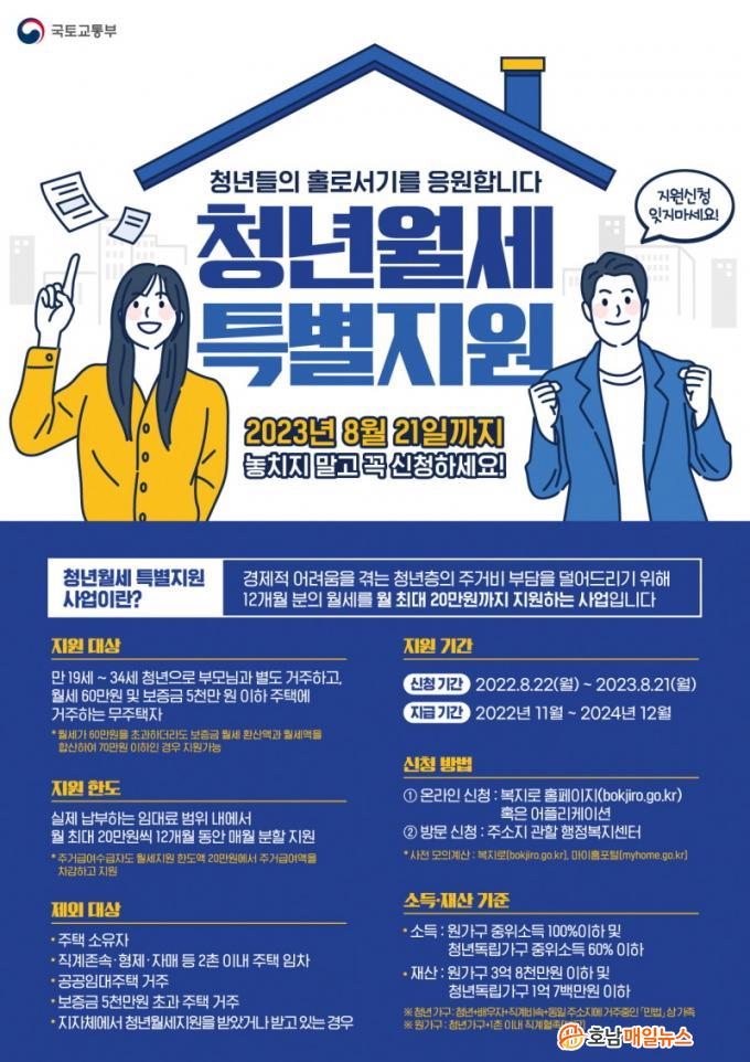 À强±ºÀº ¡®Ã»³â¿ù¼¼ÇÑ½ÃÆ¯º°Áö¿ø»ç¾÷¡¯ ½ÅûÀ» ¿À´Â 8¿ù 21ÀϱîÁö ¹Þ´Â´Ù. Áö¿ø ´ë»óÀº º¸Áõ±Ý 5000¸¸ ¿ø ÀÌÇÏ, ¿ù¼¼ 60¸¸ ¿ø ÀÌÇÏ ÁÖÅÿ¡¼ ºÎ¸ð¿Í º°µµ·Î °ÅÁÖÇÏ´Â ¸¸ 19~34¼¼ ¹«ÁÖÅà û³âÀÌ´Ù.