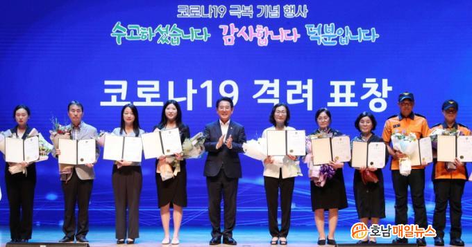 À¯°øÀÚ ½Ã»ó½Ä°ú Äڷγª19 ±Øº¹¿µ»ó, ÇåÁ¤°ø¿¬ µîÀ¸·Î ÁøÇàµÈ Çà»ç¿¡¼± Áö³ 6¿ù 1ÀÏ ÀÚ·Î Äڷγª19 À§±â ´Ü°è°¡ ¡®½É°¢¡¯¿¡¼ ¡®°æ°è¡¯ ´Ü°è·Î ÇÏÇâ Á¶Á¤µÊ¿¡ µû¶ó 3³â 6°³¿ù¿© ±â°£ ÃÖÀϼ±¿¡¼ Çå½ÅÇÑ µµ¹Î, ÀÇ·áÁø, °øÁ÷ÀÚ µî 120¿© ¸í¿¡°Ô ǥâÀ» Àü´ÞÇØ ±×µ¿¾ÈÀÇ ³ë°í¸¦ °Ý·ÁÇÏ°í °¨»çÀÇ ¸¶À½À» ÀüÇß´Ù.