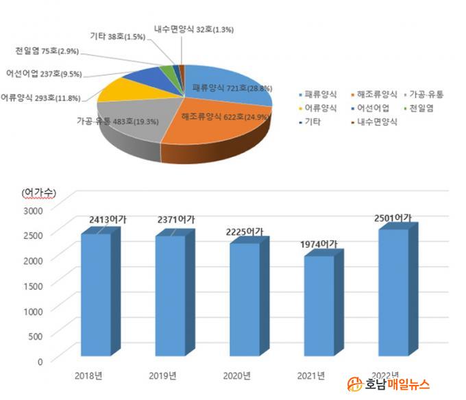 ¾÷Á¾º°·Î´Â Àüº¹, ±¼, ²¿¸· µî ÆÐ·ù ¾ç½ÄÀÌ 721¾î°¡(28.8%)·Î °¡Àå ¸¹¾Ò°í ±è¡¤¹Ì¿ª µî ÇØÁ¶·ù ¾ç½Ä 622¾î°¡(24.9%), ±¼ºñ µî °¡°ø¡¤À¯Åë 483¾î°¡(19.3%), ³ÒÄ¡¡¤¿ì·° µî ¾î·ù¾ç½Ä 293¾î°¡(11.8%), ¾î¼±¾î¾÷ 237¾î°¡(9.5%) ¼øÀ̾ú´Ù.