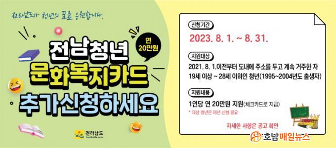 ¡®2023³â Àü³² û³â ¹®Èº¹ÁöÄ«µå Áö¿ø»ç¾÷¡¯Àº Àü¶ó³²µµ¿¡ °ÅÁÖÇϴ û³â(19¼¼~28¼¼)À» ´ë»óÀ¸·Î °ø¿¬ °ü¶÷, Çпø ¼ö°, µµ¼ ±¸¸Å µî ¹®Èº¹Áöºñ¸¦ ¿¬ 20¸¸ ¿ø Áö¿øÇÏ´Â »ç¾÷ÀÌ´Ù. ÇϹݱ⠽Åû ±â°£Àº 8¿ù 1ÀϺÎÅÍ 8¿ù 31ÀϱîÁöÀÌ´Ù. ½Åû ¹æ¹ýÀº ³óÇù Ä«µå ´©¸®ÁýÀ» ÅëÇØ ½ÅûÇϰųª, ½ÅûÀÚ Áֹεî·Ï»ó ÁÖ¼ÒÁö °üÇÒ À¾¡¤¸é Áֹμ¾ÅÍ¿¡ ¹æ¹® ½ÅûÇÏ¸é µÈ´Ù.
