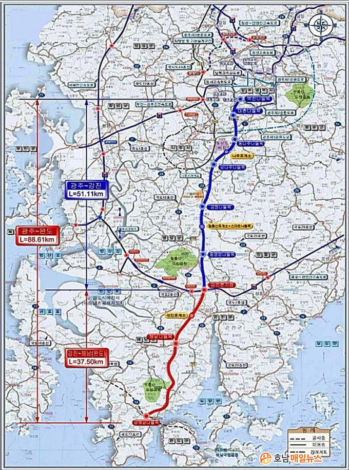 ±¤ÁÖ~¿Ïµµ°£ °í¼Óµµ·Î 2´Ü°è ±¸°£Àº °Áø±º ÀÛõ¸é¿¡¼ ÇØ³²±º ºÏÆò¸é±îÁö 38.9km ±¸°£À¸·Î ±¹ºñ 1Á¶ 5,965¾ï¿øÀÌ ÅõÀԵȴÙ. ±¤ÁÖ~¿Ïµµ °í¼Óµµ·Î »ç¾÷Àº 2026³â±îÁö ±¤ÁÖ ¼±¸ º®Áøµ¿ ~ °Áø ÀÛõ±îÁö 51.11km ±¸°£ 1´Ü°è °ø»ç¸¦ ÁذøÇÒ ¿¹Á¤À¸·Î, 2´Ü°è ±¸°£ÀÇ ¿¹ºñŸ´ç¼º Åë°ú¿Í ¼³°èºñ ¹Ý¿µÀÌ ½Ã±ÞÇÑ »óȲÀÌ´Ù.