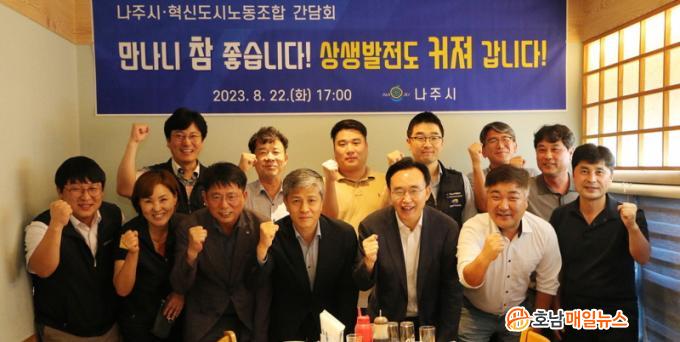 ³ªÁÖ½Ã(½ÃÀå À±º´ÅÂ)´Â ÃÖ±Ù À±º´Å ½ÃÀå°ú Çõ½Åµµ½Ã³ëÁ¶¿Í ¼ÒÅë °£´ãȸ¸¦ °¡Á³´Ù°í 28ÀÏ ¹àÇû´Ù. Çõ½Åµµ½Ã³ëÁ¶´Â Çѱ¹Àü·Â°ø»ç, ÇÑÀüKDN, ÇÑÀüKPS, ÇÑÀüFMS, ÇÑÀüCSC µî 5°³ Àü·Â ±â°ü ³ëµ¿ÀÚ¸¦ À§ÇÑ ´Üü´Ù. À̳¯ °£´ãȸ¿¡´Â 5°³»ç ³ëÁ¶ ÀÓ¿øÁø 12¸íÀÌ Âü¼®ÇÑ °¡¿îµ¥ ºû°¡¶÷µ¿ ¸ð ½Ä´ç¿¡¼ ÁøÇàµÆ´Ù.