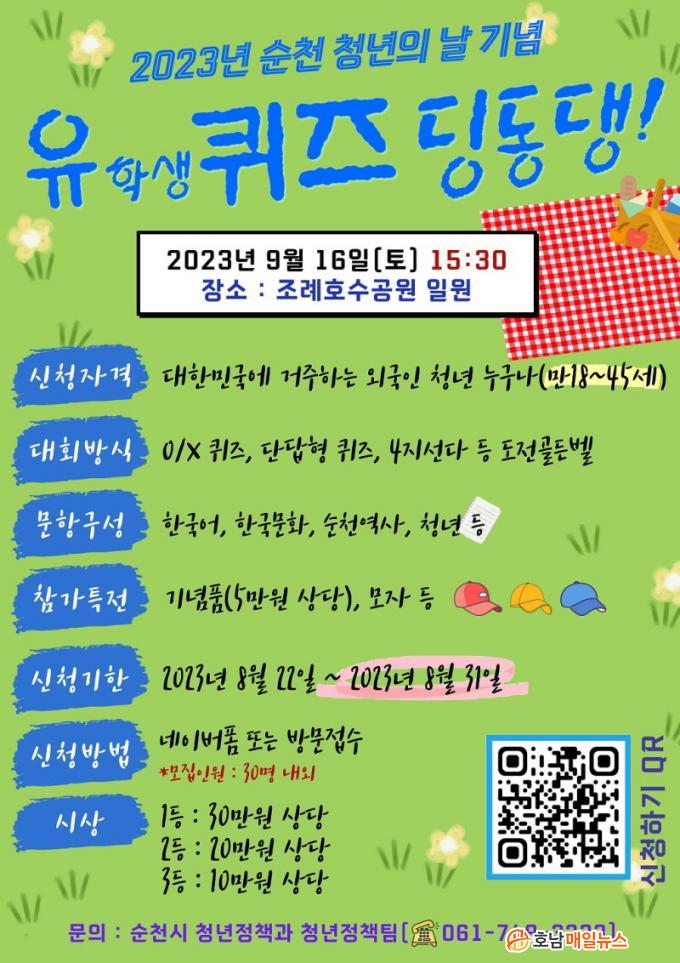 À̹ø ÄûÁî´ëȸ´Â ´ÙÀ½ ´Þ 16ÀÏ Á¶·ÊÈ£¼ö°ø¿ø¿¡¼ ÁøÇàÇÒ 2023³â ¼øÃµ û³âÀÇ ³¯ ±â³äÇà»ç¿¡¼ ´ëÇѹα¹¿¡ »ì°í ÀÖ´Â ¿Ü±¹ÀΠû³âµéÀÌ ¸ð¿© Çѱ¹°ú û³â¿¡ ´ëÇÑ ¹®Á¦¸¦ Ǫ´Â ÄûÁî´ëȸÀÌ´Ù.
