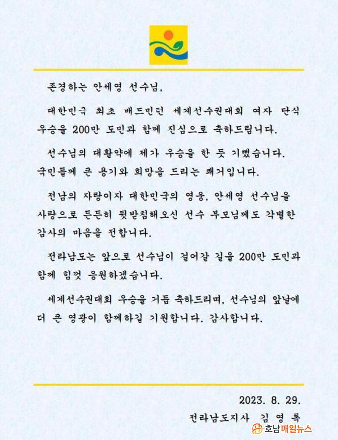 ±è¿µ·Ï Àü³²µµÁö»ç´Â 29ÀÏ ¾È¼¼¿µ ¼±¼ö¿¡°Ô Àü³²µµ¹ÎÀÇ ¸¶À½À» ´ã¾Æ ÃàÀüÀ» º¸³Â´Ù.