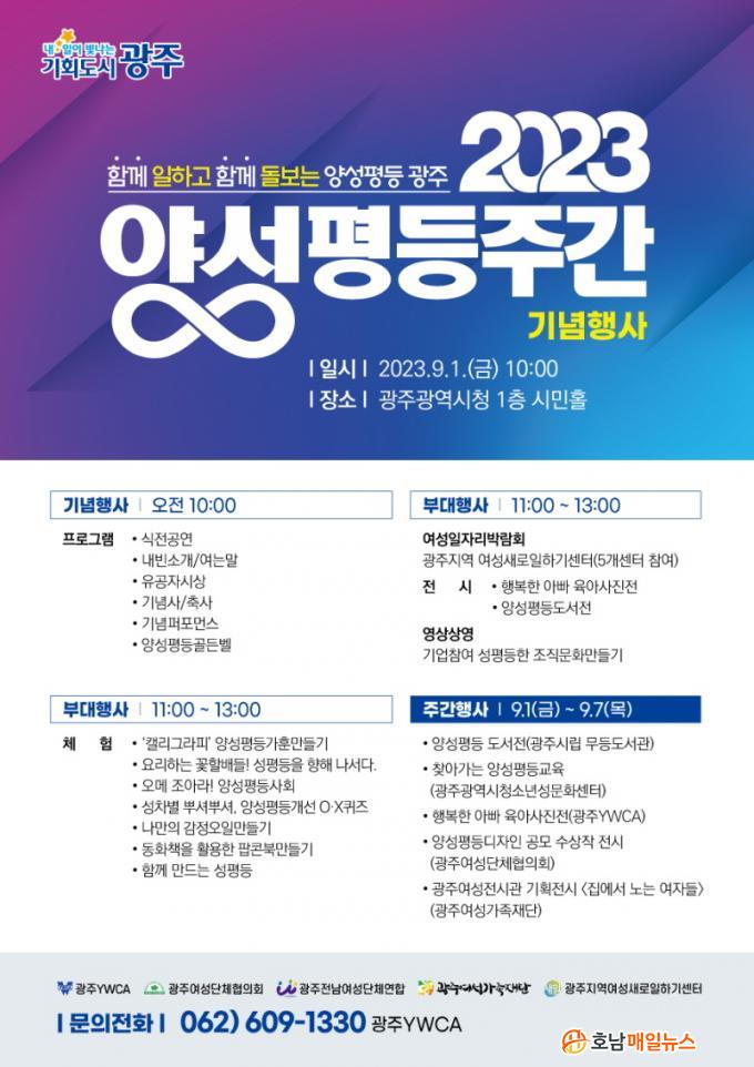 9¿ù 1ÀϺÎÅÍ 7ÀϱîÁö ¾ç¼ºÆòµî±â³äÁÖ°£¿¡ ¾ç¼ºÆòµî µµ¼Àü(½Ã¸³¹«µîµµ¼°ü), ã¾Æ°¡´Â ¾ç¼ºÆòµî±³À°(±¤ÁÖû¼Ò³â¼º¹®È¼¾ÅÍ), ÇູÇÑ ¾Æºü À°¾Æ»çÁøÀü(±¤ÁÖYWCA), ¾ç¼ºÆòµîµðÀÚÀÎ °ø¸ð ¼ö»óÀÛ Àü½Ã(±¤ÁÖ¿©¼º´ÜüÇùÀÇȸ), ±¤ÁÖ¿©¼º°¡Á·Àç´Ü ¿©¼ºÀü½Ã°ü ±âȹÀü½Ã(Áý¿¡¼ ³ë´Â ¿©ÀÚµé) µî ´Ù¾çÇÑ Çà»ç°¡ ¿¸°´Ù.
