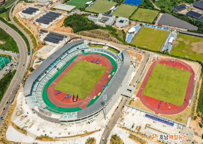 ¸ñÆ÷Á¾ÇÕ°æ±âÀåÀº ´ëȸÀÇ ¹é¹Ì¶ó°í ÇÒ ¼ö ÀÖ´Â Àü±¹Ã¼Àü °³‧Æóȸ½Ä°ú Àå¾ÖÀÎüÀü °³È¸½Ä, À°»ó°æ±â°¡ ÁøÇàµÈ´Ù. ½Ã¼³ ±Ô¸ð´Â ÁÖ°æ±âÀå°ú º¸Á¶°æ±âÀåÀ» Æ÷ÇÔÇØ ¿¬¸éÀû 26,468Á¦°ö¹ÌÅÍ·Î, ÁÖ°æ±âÀåÀº Áö»ó 3Ãþ, 16,468¼®ÀÇ °ü¶÷¼®À» °®Ãß°í ÀÖ´Ù. °æ±âÀåÀº õ¿¬Àܵ𠱸Àå°ú 9·¹ÀÎÀÇ À°»óÆ®·¢ÀÌ °®ÃçÁ® ÀÖ´Â °øÀÎ 1Á¾ À°»ó°æ±âÀåÀ¸·Î, ¸ñÆ÷ÀÇ ÈÇÕ°ú ¹Ì·¡¸¦ »ó¡ÇÏ´Â ¿¸° °æ±âÀåÀ» Ç¥¹æÇØ ¼³°èµÆ°í, ±× Áß ÁöºØÀº ¸ñÆ÷ÀÇ ½ÃÁ¶(ã¼ðè)ÀÎ ÇÐÀ» Çü»óÈÇß´Ù.