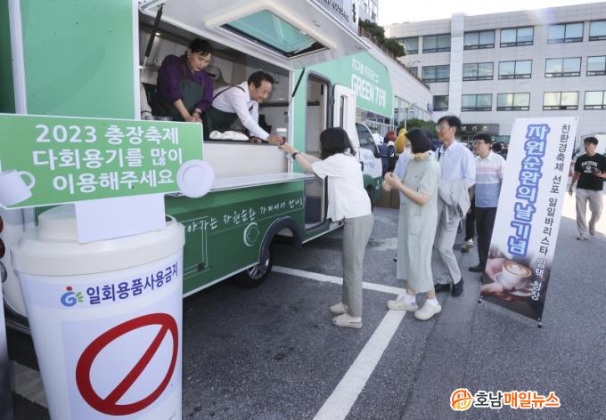 À̳¯ Çà»ç¿¡¼´Â ÀÓÅà µ¿±¸Ã»ÀåÀÌ Ãâ±ÙÇÏ´Â Á÷¿øµé¿¡°Ô Á÷Á¢ ´Ùȸ¿ëÄÅ¿¡ ´ãÀº Ä¿ÇǸ¦ °Ç³×¸ç ÀÏȸ¿ëǰ Àý°¨À» µ¶·ÁÇϰí ÅÒºí·¯¸¦ ³ª´³´Ù. ´õºÒ¾î Á¦20ȸ ÃæÀåÃàÁ¦°¡ ´Ùȸ¿ëÄŰú ´Ùȸ¿ë±â¸¦ »ç¿ëÇÏ´Â Áö¼Ó °¡´ÉÇÑ Ä£È¯°æ ÃàÁ¦·Î °Åµì³¯ °ÍÀ» È«º¸Çß´Ù.