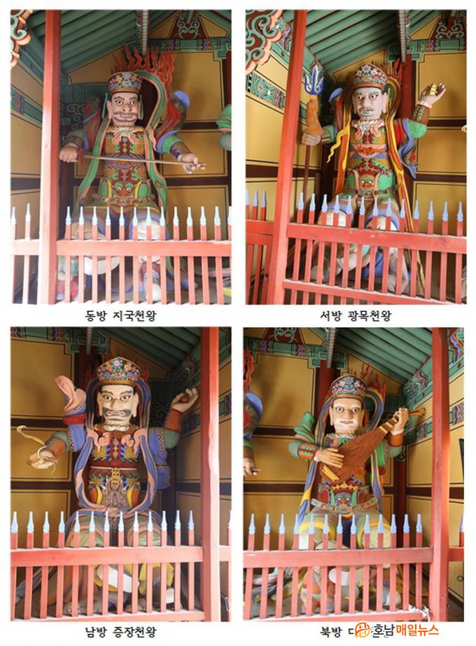»çõ¿Õ»óÀº Àý(ÞÑ) ÀÔ±¸ õ¿Õ¹®¿¡ ºÀ¾ÈµÇ¾î »çÂû°ú ´ëÁßÀ» ÁöŰ´Â ¿ªÇÒÀ» Çϴ ȣ¹ý½ÅÀÌ´Ù. °¢ ¹æÇâ¿¡ µû¶ó µ¿ÂÊÀº Áö±¹Ãµ¿Õ, ¼ÂÊÀº ±¤¸ñõ¿Õ, ³²ÂÊÀº ÁõÀåõ¿Õ, ºÏÂÊÀº ´Ù¹®Ãµ¿ÕÀ¸·Î ºÒ¸®¸ç, °¢°¢ º¸°Ë, º¸´ç(±ê¹ß ´Þ¸° â), ¿ë°ú ¿©ÀÇÁÖ, ºñÆÄ µîÀ» ¼Õ¿¡ Àâ°í ÀÖ´Ù. ¶Ç ºÎ¸¨¶á ´«, Å©°Ô ¹ú¾îÁø ÀÔ°ú ²À ´Ù¹® ÀÔ¼ú, °©¿ÊÀ» ÀÔ°í ÀÖ´Â ½Åü, ¹ß¾Æ·¡¿¡´Â ¾Ç±Í µîÀÇ »ý·ÉÁ¸¦ ¹â°í ÀÖ´Â ¸ð½ÀÀ¸·Î Ç¥ÇöµÇ¾î ÀÖ´Ù.