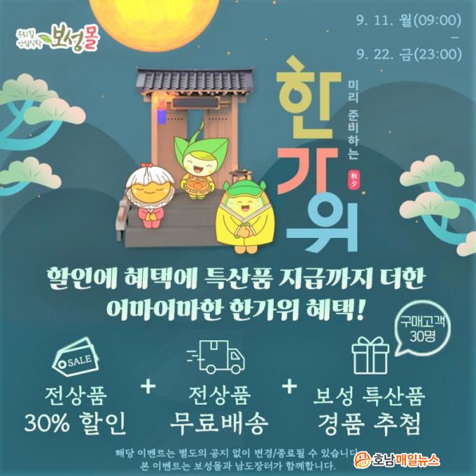 º¸¼º¸ô Ãß¼® Ưº° ÇÒÀÎÇà»ç´Â 160¿© °³ ¾÷üÀÇ 430¿© °³ ³óƯ»ê¹° Á¦Ç°À» Àü¶ó³²µµ¡¤½Ã¡¤±º Çù¾÷ ÆÇÃË ±âȹÀü »ç¾÷°ú ¿¬°èÇÏ¿© 30% ÇÒÀÎ ÆÇ¸ÅÇϸç, Àü Á¦Ç° ¹«·á¹è¼Û, ±¸¸ÅÀÚ Ãß÷À» ÅëÇÑ °æÇ° ÁõÁ¤ À̺¥Æ®µµ ÁøÇàÇÑ´Ù. ¶ÇÇÑ, Ãß¼® ¼±¹° ¼¼Æ®·Î º¸¼º±º ³óƯ»ê¹° ²Ù·¯¹Ì »óǰ ¡®º¸¼ºÀ» ´Ù(Òý¡¤Òþ)´ã´Ù¡¯ 2Á¾À» ÆÇ¸ÅÇÑ´Ù. ±¸¼ºÇ°À¸·Î´Â ÇѺÀ Çã´Ï½ºÆ½, ³ìÂ÷ ºñ´©, ¿Ãº½Ò, º¸¼º¸ô 5õ ¿ø ÄíÆù µîÀÌ Æ÷ÇԵȴÙ.