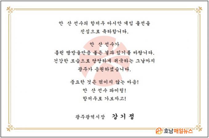 °±âÁ¤ ±¤ÁÖ±¤¿ª½ÃÀåÀÌ Ç×Àú¿ì ¾Æ½Ã¾È°ÔÀÓ ÃâÀü ±¤Áֽà ¼Ò¼Ó ±¹°¡´ëÇ¥ ¼±¼öµé¿¡°Ô ÀÀ¿øÀÇ ÆíÁö¸¦ º¸³Â´Ù.
