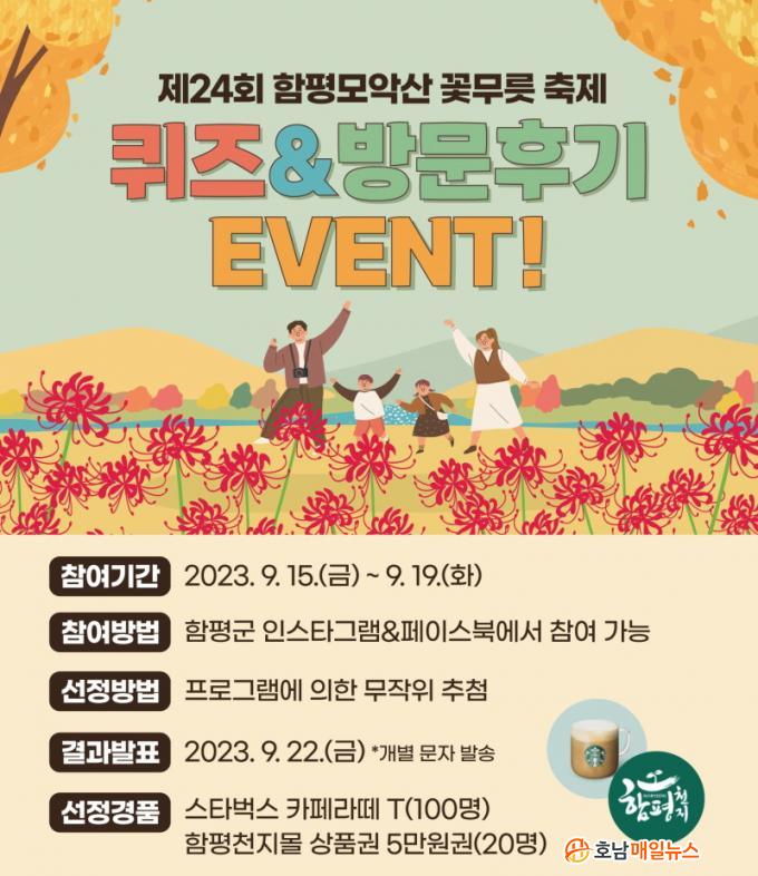 À̹ø À̺¥Æ®´Â ÄûÁîÀ̺¥Æ®¿Í ¹æ¹® Èıâ ÀÛ¼ºÀ» ÅëÇØ Âü¿©ÇÒ ¼ö ÀÖ´Ù. ÄûÁîÀ̺¥Æ®´Â Á¦½ÃµÈ À̹ÌÁö¸¦ º¸°í ÇÔÆòÀÇ ´ëÇ¥ ÃàÁ¦¸íÀ» ¸ÂÈ÷´Â °ÍÀÌ¸ç ¹æ¹® Èıâ À̺¥Æ®´Â ²É¹«¸© ÃàÁ¦¸¦ ¹æ¹®ÇÑ »çÁøÀ» °³ÀÎ SNS¿¡ ¾÷·ÎµåÇϰí ÀÎÁõ»çÁøÀ» Á¦ÃâÇÏ¸é µÈ´Ù.