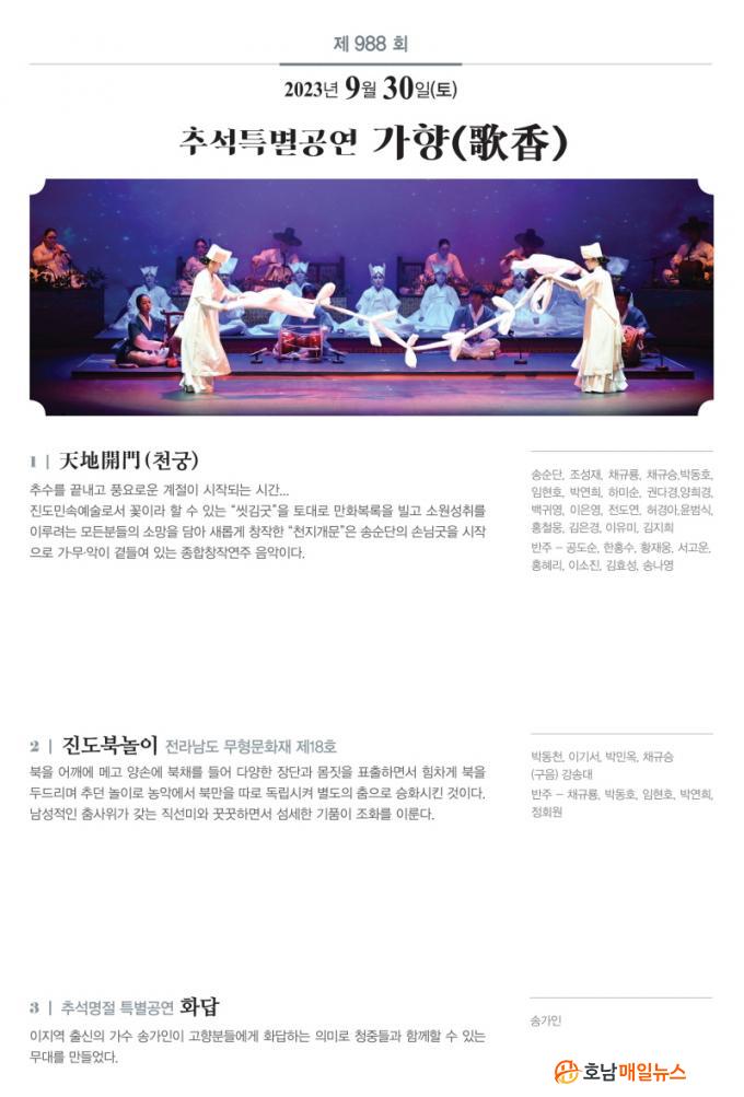 À̹ø °ø¿¬Àº Ãß¼®À» ¸Â¾Æ Á¾ÇÕâÀÛ¿¬ÁÖ À½¾ÇÀÎ ¡®ÃµÁö°³¹®(õ±Ã)¡¯, ¡®ÁøµµºÏ³îÀÌ¡¯, Ãß¼®¸íÀý Ưº°°ø¿¬ÀÎ ¡®È´ä¡¯ µî ´Ùä·Î¿î °ø¿¬À» ¼±º¸ÀÏ ¿¹Á¤ÀÌ´Ù.