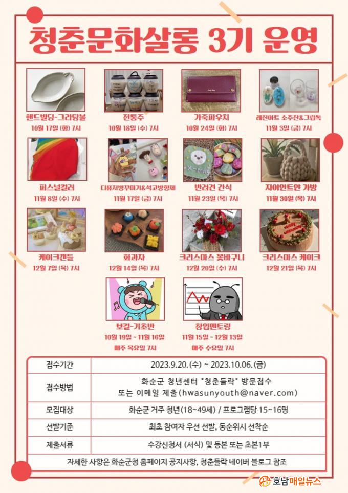 ¸ðÁý ´ë»óÀº 18¡49¼¼ ȼø±º °ÅÁÖ Ã»³âÀ¸·Î, ÇÁ·Î±×·¥´ç 15¡16¸íÀ» ¸ðÁýÇϸç, Âü¿©¸¦ Èñ¸ÁÇϴ û³âÀº ¼ö°½Åû¼ ¹× Áֹεî·Ïµîº» ¶Ç´Â Ãʺ» 1ºÎ¸¦ ȼø±º û³â¼¾ÅÍ ¡°Ã»Ãá µé¶ô¡± »ç¹«½Ç¿¡ ¹æ¹®¡¤Á¢¼öÇϰųª À̸ÞÀÏ(hwasunyouth@naver.com)·Î Á¦ÃâÇÑ´Ù.