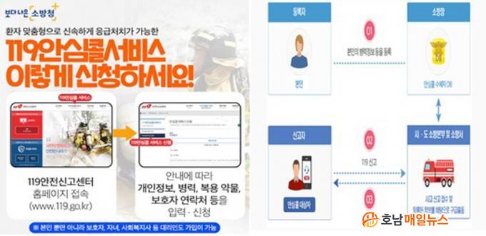 ¡®119¾È½ÉÄÝ ¼ºñ½º¡¯´Â »çÀü¿¡ ÀÔ·ÂµÈ È¯ÀÚÀÇ Á¤º¸¸¦ Ȱ¿ëÇØ ±¸±Þ´ë¿øµéÀÌ ¹Ì¸® Áúº´¡¤Æ¯¼ºÀ» ¾Ë°í ½Å¼ÓÇÑ ÀÀ±Þóġ¿Í º´¿ø À̼ÛÀÌ °¡´ÉÇÑ ¼ºñ½ºÀÌ´Ù. ¶ÇÇÑ »çÀü µî·ÏµÈ º¸È£ÀÚ¿¡°Ô ȯÀÚ º´¿ø ÀÌ¼Û »óȲ ¹× »óŸ¦ ¸Þ½ÃÁö·Î ¹Þ¾Æº¼ ¼ö ÀÖ´Ù.
