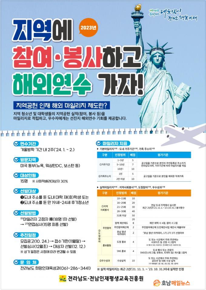 Àü³²µµ´Â 10¿ù Çϼø²² ¸ðÁý °ø°í¸¦ °ÅÃÄ 12¿ù ´ë»óÀÚ¸¦ ¼±¹ßÇϰí, 2024³â 1~2¿ù²² 2ÁÖ ÀÏÁ¤À¸·Î ÇØ¿Ü¿¬¼ö(¹Ì±¹ ¿¹Á¤)¸¦ ÃßÁøÇÒ °èȹÀÌ´Ù. ±âŸ ÀÚ¼¼ÇÑ »çÇ×Àº Àü³²µµ Èñ¸ÁÀÎÀçÀ°¼º°ú ±³À°Áö¿øÆÀ(061-286-3441)À¸·Î ¹®ÀÇÇÏ¸é µÈ´Ù.