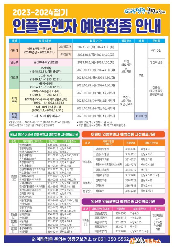 Á¢Á¾´ë»óÀº ¿µ±¤±º¿¡ ÁÖ¼ÒÁö¸¦ µÐ ¡ã60~64¼¼ ¡ã14~18¼¼ ¡ã50¼¼ÀÌ»ó ±âÃÊ»ýȰ¼ö±ÞÀÚ ¡ã½ÉÇÑÀå¾Ö(±¸.1~3±Þ) ¡ã±¹°¡À¯°øÀÚ(º»ÀÎ)·Î ½ÅºÐÁõ ¹× Áõºù¼·ù¸¦ ÁöÂüÇÏ¸é º¸°Ç¼Ò(Áö¼Ò¡¤Áø·á¼Ò)¿¡¼ ¹«·á ¿¹¹æÁ¢Á¾À» ¹ÞÀ» ¼ö ÀÖ´Ù. ±× ¿Ü ¿µ±¤±º¹Î, Ÿ Áö¿ª °ÅÁÖÀÚ´Â À¯·áÁ¢Á¾ÀÌ °¡´ÉÇϸç, Á¢Á¾ºñ´Â 11,000¿øÀÌ´Ù.