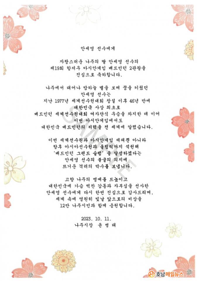 À±º´Å ³ªÁÖ½ÃÀåÀÌ Ç×Àú¿ì ¾Æ½Ã¾È°ÔÀÓ¿¡¼ ¹èµå¹ÎÅÏ 2°ü¿ÕÀ» Â÷ÁöÇÑ ¾È¼¼¿µ ±¹°¡´ëÇ¥¿¡°Ô ÃàÀüÀ» º¸³Â´Ù°í 12ÀÏ ¹àÇû´Ù.