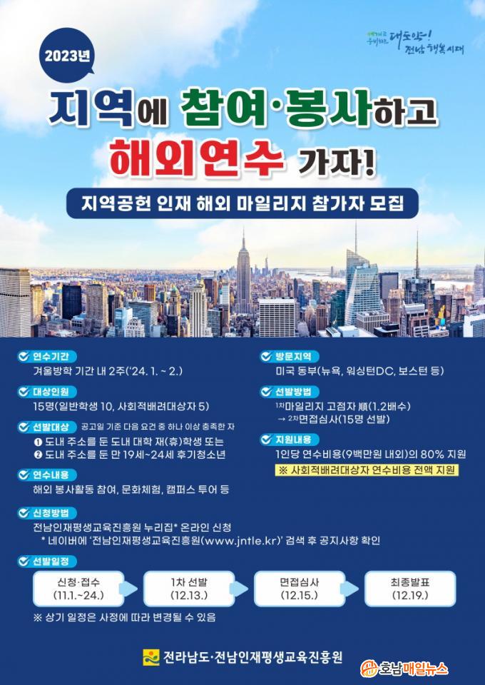 Àü³²µµÀÇ ¡®Áö¿ª°øÇå ÀÎÀç ÇØ¿Ü ¸¶Àϸ®Áö¡¯´Â Áö¿ª°øµ¿Ã¼¿¡ Âü¿©ÇÏ°í ºÀ»çÇÑ ½ÇÀûÀ» Åä´ë·Î Áö¿ª û¼Ò³â¿¡°Ô ¼±ÁøÁö ÇØ¿Ü¿¬¼ö ±âȸ¸¦ Á¦°øÇÏ´Â »ç¾÷ÀÌ´Ù.