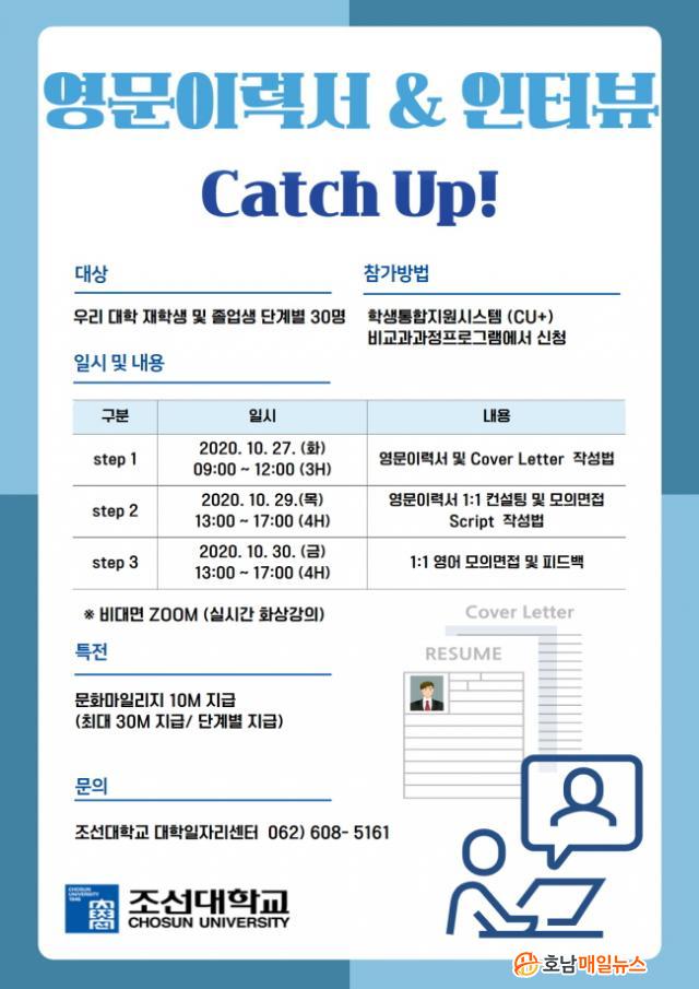 Á¶¼±´ëÇб³ ´ëÇÐÀÏÀÚ¸®¼¾ÅÍ¿¡ µû¸£¸é ÀçÇлý°ú Á¹¾÷»ýÀÌ¸é ´©±¸³ª Âü¿© °¡´ÉÇÑ '¿µ¹®À̷¼&ÀÎÅͺä Catch Up!'Àº Äڷγª19 »çÅ¿¡ µû¶ó ¿Â¶óÀÎÀ¸·Î ÁøÇàµÉ ¿¹Á¤À̰í, ¿Ü±¹°è ±â¾÷ Ãë¾÷ Èñ¸Á ÇлýµéÀ» ´ë»óÀ¸·Î ¿µ¹® ÀԻ缷ù ¹× ¿µ¾î ¸éÁ¢ ¿ª·® Çâ»óÀ» À§ÇØ ¸¶·ÃµÈ´Ù.