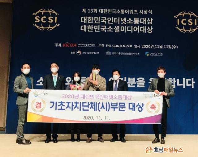 ³ªÁÖ½Ã(½ÃÀå °ÀαÔ)´Â 11ÀÏ ¼¿ï½Ã Áß±¸ ¼ÒÀç Çѱ¹¾ð·ÐÁøÈïÀç´Ü ÇÁ·¹½º¼¾ÅÍ¿¡¼ °³ÃÖµÈ Á¦13ȸ ´ëÇѹα¹ ¼ÒÅë¾î¿öÁî¿¡¼ ±âÃÊÁöÀÚü ½Ã(ã¼)ºÎ¹® ¡®ÀÎÅͳݼÒÅë´ë»ó¡¯À» ¼ö»óÇß´Ù°í ¹àÇû´Ù.