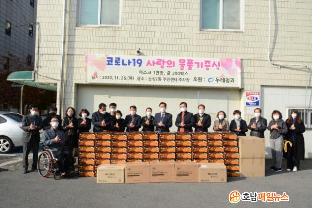 À̳¯ Äڷγª19 »ç¶ûÀÇ ¹°Ç° Àü´Þ½ÄÀº µÎ·¹Ã»°ú¢ß¿¡¼ ¸¶½ºÅ© 10,000Àå, ±Ö 200¹Ú½º¸¦ ÈÄ¿øÇßÀ¸¸ç, ÀåÀ缺 ÀÇ¿øÀÇ ¹ß±¼ ¾Ë¼±À¸·Î ÀÌ·ïÁ³´Ù.