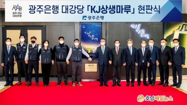 ÇÑÆí, ¼ÛÁ¾¿í ±¤ÁÖÀºÇàÀåÀº ¡®»ó»ýÀÇ Èû, Áö¿ª°æÁ¦¿ÍÀÇ »ó»ý¡¤Áö¿ª¹Î°úÀÇ µ¿ÇàÀ¸·Î 100³â ÀºÇàÀ» ÇâÇØ ÈûÂ÷°Ô ³ª¾Æ°©½Ã´Ù¡¯¶ó°í Á÷Á¢ ¸Þ½ÃÁö¸¦ ´ãÀº ÇöÆÇÀ» Á¦¸·ÇÏ¸ç ¡°Áö¿ª»ó»ý¹ßÀü°ú Áö¿ª¹ÐÂø°æ¿µ ½ÇõÀ» ÅëÇØ ÀÌÀÍ ÀÌ»óÀÇ °¡Ä¡¸¦ Ãß±¸ÇÏ´Â ±¤ÁÖÀºÇàÀÇ °æ¿µÀ̳äÀ» ´ã¾Æ »õ·Ó°Ô ´ÜÀåÇÑ ¡®KJ»ó»ý¸¶·ç¡¯¿¡¼ ÀÓÁ÷¿øµéÀÌ Áö¿ª°æÁ¦ Ȱ¼ºÈ¸¦ À§ÇÑ Áö¿ª°úÀÇ »ó»ýÀ» µµ¸ðÇϰí, Áö¿ª¹Î°ú ´õ °¡±îÀÌ ¸¶ÁÖÇÏ±æ ¹Ù¶õ´Ù¡±°í ¸»Çß´Ù.