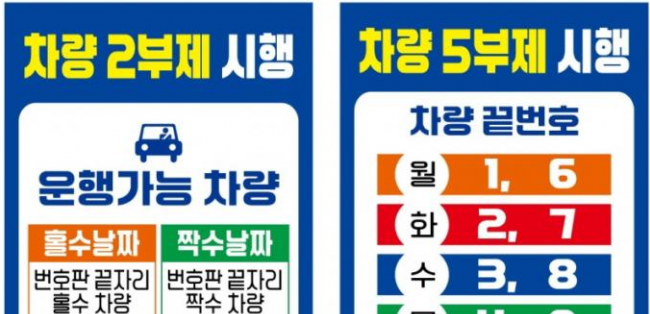 ½Â¿ëÂ÷ 5ºÎÁ¦´Â µµÃ»À» ¹æ¹®ÇÏ´Â ¹Î¿øÀÎ Â÷·®°ú °ø¿µÁÖÂ÷Àå¿¡ Àû¿ëµÈ´Ù. Â÷·®¹øÈ£ ³¡ÀÚ¸®¿¡ µû¶ó ÇØ´ç ¿äÀÏ¿¡´Â ÃâÀÔ ÀÌ Á¦ÇѵǸç, ¿äÀϺ° Àû¿ë ±âÁØÀº ¡ã¿ù¿äÀÏ 1¡¤6 ¡ãÈ¿äÀÏ 2¡¤7 ¡ã¼ö¿äÀÏ 3¡¤8 ¡ã¸ñ¿äÀÏ 4¡¤9 ¡ã±Ý¿äÀÏ 5¡¤0ÀÌ´Ù.