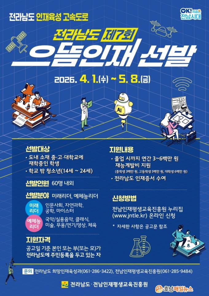 ¿ÃÇØ´Â Áö¿ª Áß¡¤°í¡¤´ëÇлýÀ» ´ë»óÀ¸·Î Àι®»çȸ, ÀÚ¿¬°úÇÐ, °øÇÐ, ¸¶À̽ºÅÍ µî ¡®¹Ì·¡¸®´õ¡¯¿Í ±¹¾Ç¡¤½Ç¿ëÀ½¾Ç, Ŭ·¡½Ä, ¹Ì¼ú, ¹«¿ë¡¤¿¬±â¡¤¿µ»ó, üÀ° µî ¡®¿¹Ã¼´É ¸®´õ¡¯, 2°³ ºÐ¾ß¿¡¼ ÃÑ 60¿© ¸íÀ» ¼±¹ßÇÑ´Ù.