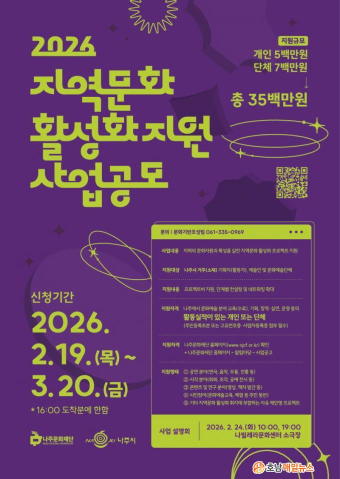 ³ªÁÖ¹®ÈÀç´ÜÀº ¡®2026 Áö¿ª¹®È Ȱ¼ºÈ Áö¿ø»ç¾÷¡¯ °ø¸ð¸¦ ¿À´Â 3¿ù 20ÀÏ ¿ÀÈÄ 4½Ã±îÁö ÁøÇàÇÑ´Ù°í 19ÀÏ ¹àÇû´Ù.