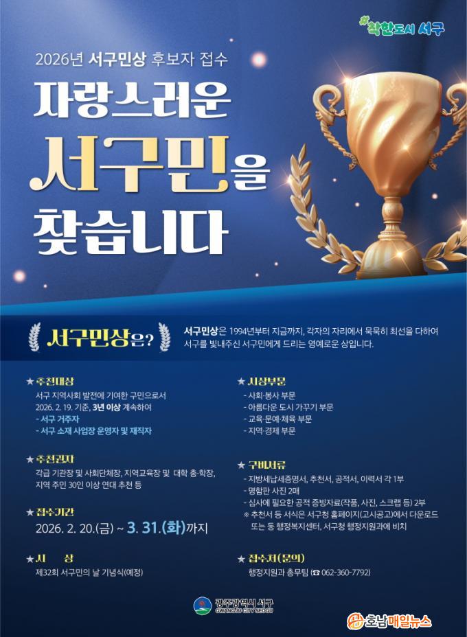 Èĺ¸ÀÚ Ãßõ ±âÇÑÀº 3¿ù31ÀϱîÁöÀ̸ç Ãßõ¼, °øÀûÁ¶¼ µî °ü·Ã ¼·ù¸¦ ÁغñÇØ ¼±¸Ã» ÇàÁ¤Áö¿ø°ú(062-360-7792)·Î Á¦ÃâÇÏ¸é µÈ´Ù. ½Ã»ó½ÄÀº ¡®Á¦32ȸ ¼±¸¹ÎÀÇ ³¯¡¯ ±â³äÇà»ç¿¡¼ ÁøÇàµÉ ¿¹Á¤ÀÌ´Ù.