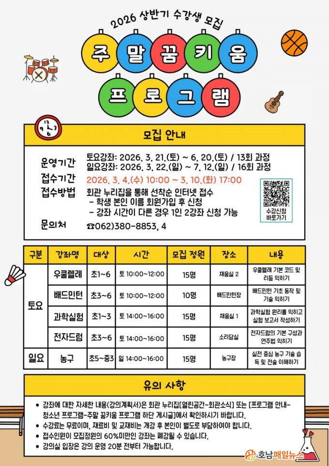 Åä¿äÀÏ °úÁ¤Àº ÃÑ 13ȸ ¿î¿µµÇ¸ç ¹®È¿¹¼úȰµ¿(¿ìÄð·¼·¹, ÀüÀڵ巳)°ú ¹èµå¹ÎÅÏ µî ½Åü Ȱµ¿, °úÇнÇÇè Ž±¸·Î ±¸¼ºµÆ´Ù. ³ó±¸´Â ÀÏ¿äÀÏ °úÁ¤À¸·Î ÃÑ 16ȸ ÁøÇàµÇ¸ç Ãʵî»ý 5ÇгâºÎÅÍ Âü¿© °¡´ÉÇÏ´Ù.