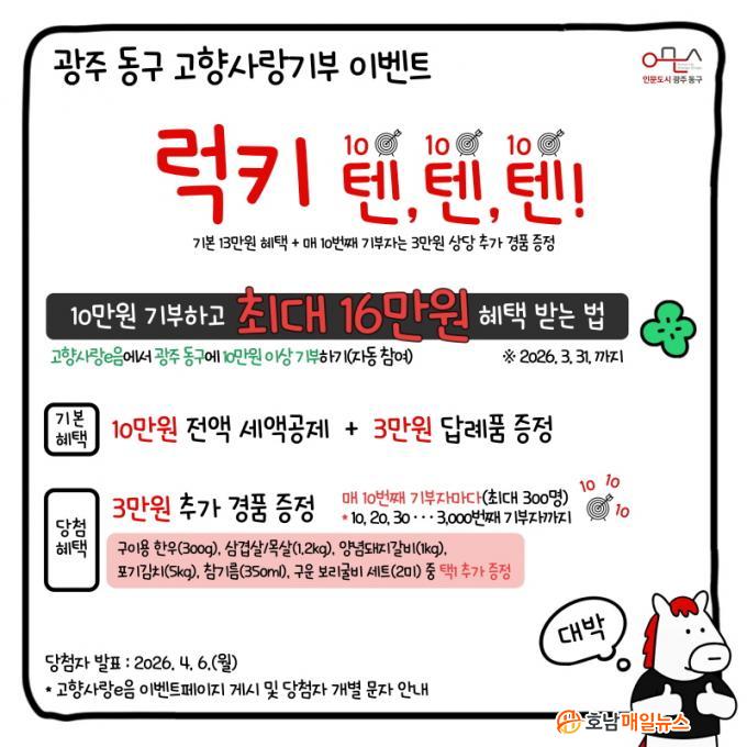 À̺¥Æ® ±â°£Àº ÀÌ´Þ 1ÀϺÎÅÍ 31ÀϱîÁöÀ̸ç, °íÇâ»ç¶û±âºÎ °ø½Ä Ç÷§Æû ¡®°íÇâ»ç¶ûeÀ½¡¯À» ÅëÇØ ±¤ÁÖ µ¿±¸¿¡ 10¸¸ ¿ø ÀÌ»ó ±âºÎÇÑ »ç¶÷À» ´ë»óÀ¸·Î ÇÑ´Ù. ´©Àû ±âºÎ ¼ø¼ ±âÁØÀ¸·Î 10¹øÂ°, 20¹øÂ°, 30¹øÂ° µî ¸Å 10¹øÂ° ±âºÎÀÚ¿¡°Ô 3¸¸ ¿ø »ó´çÀÇ ´ä·ÊǰÀ» Ãß°¡ Á¦°øÇϸç, ÃÖ´ë 3,000¹øÂ° ±âºÎÀÚ±îÁö ÃÑ 300¸íÀÌ ÇýÅÃÀ» ¹Þ°Ô µÈ´Ù.
